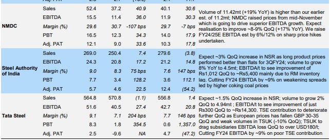 For SAIL, it revised downward its FY24E EPS by 14 per cent, given reduction in steel spreads and maintain ‘Accumulate’ rating with revised target of Rs 92 from Rs 95 earlier. In the case of NMDC, it increased its FY24/FY25E earnings estimates by 7 per cent/17 per cent, given rising iron ore prices in mid-November and again in January. It upgraded the stock to ‘Buy’ from 'Accumulate' with revised target of Rs 261 based on 6 times FY26 EV/Ebitda against an earlier target of Rs 176, which was based on 5 times on stronger than expected delivery on both volumes and prices.