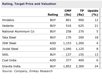 Among metals & mining shares, the brokerage suggested 'Buy' rating on Hindalco, Vedanta, Nalco, Tata Steel and Gravita India. It has 'Add' rating on JSW Steel and Coal India.