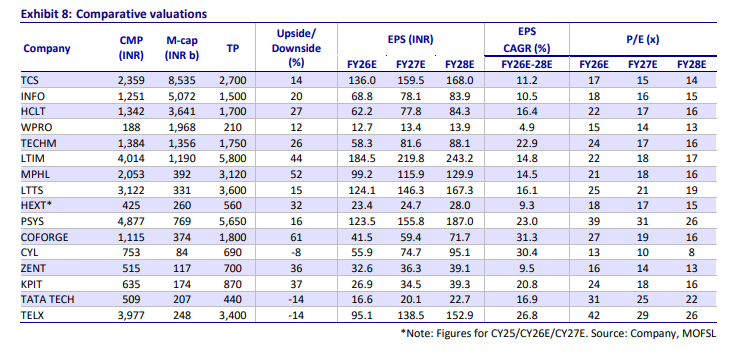For HCL Tech, MOFSL sees 3–6 per cent YoY CC growth for services. The top-end of this guidance assumes mild improvement in CQGR over FY26, while the bottom end assumes uncertainty from war.