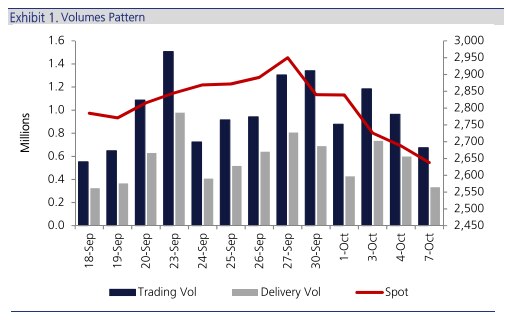 The scrip has declined from a high of Rs 2,958 level to a low of Rs 2,621 level recently. The fall was on the back of lower than average traded volumes and delivery volumes. Tuesday's trading volumes stood at 0.7 million shares against last 10-session average of 1.1 million, shares while delivery volumes stood at 0.3 million shares against an average of 0.6 million shares. Overall data indicates lack of aggressive cash sellers at these levels, JM Financial said.
