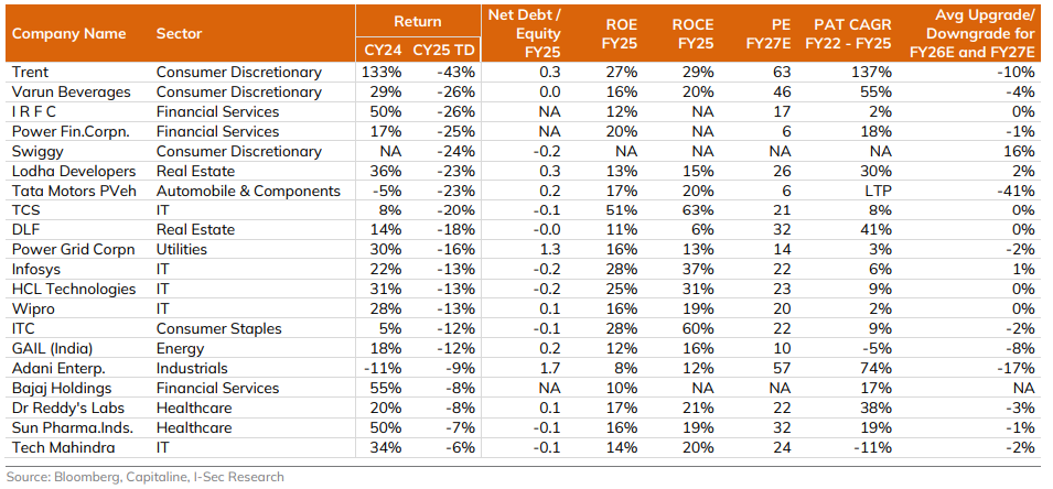 A common theme among 2025 underperformers was a mix of high valuations, exposure to the external sector, and growth concerns. However, stocks with improving growth outlook and, in some cases, reasonable valuations such as SBI, Vedanta, M&M, BPCL, Bharti Airtel, Bharat Electronics and Shriram Finance continued their momentum to outperform both in 2024 and 2025, ICICI Securities said.