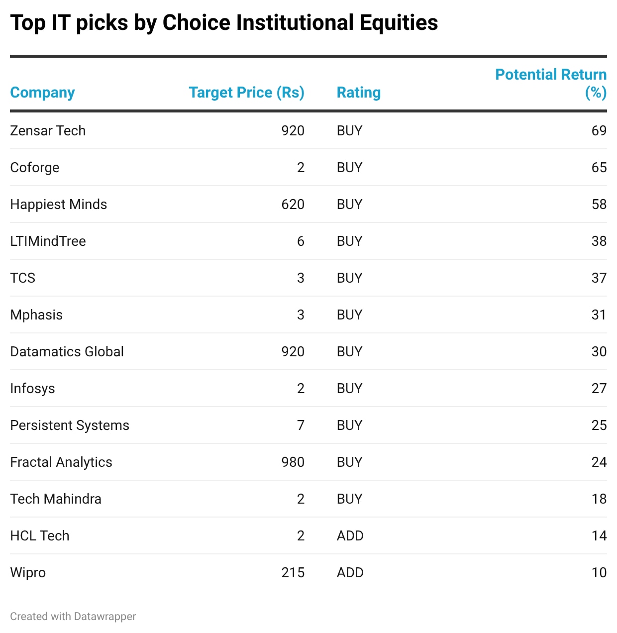 Choice has a 'buy' ratings on Zensar Tech (Target Price: Rs 920), LTIMindTree (Target Price: Rs 5,920), TCS (Target Price: Rs 3,350), Mphasis (Target Price: Rs 2,888), Datamatics (Target Price: Rs 920), Infosys (Target Price: Rs 1,650) and Tech (Target Price: Rs 1,700) as well. HCL Technologies (Target Price: Rs 1,600) and Wipro (Target Price: Rs 215) have an 'add' rating from Choice.