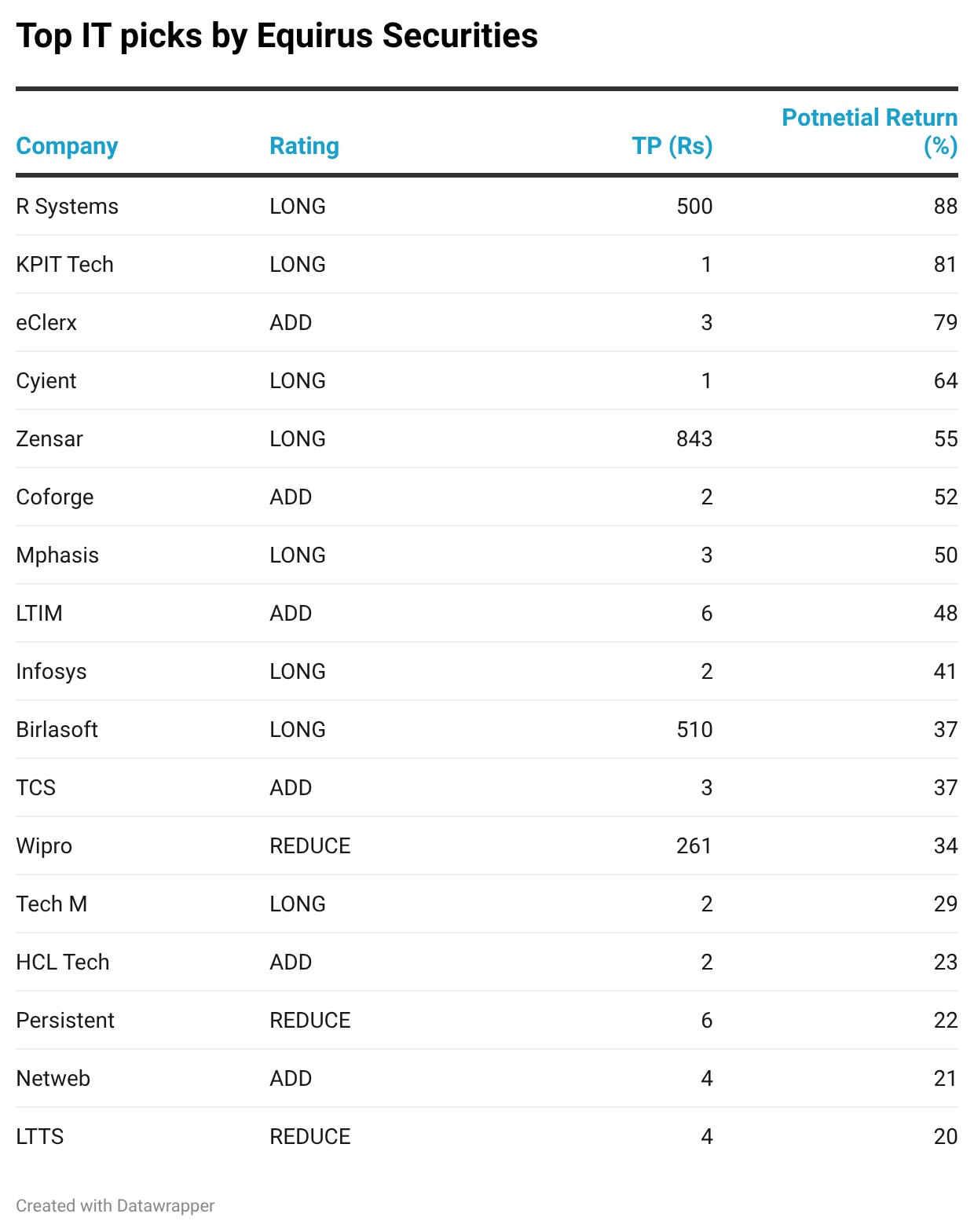It also has a 'long' rating on Cyient (Target Price: Rs 1,320), R Systems (Target Price: Rs 500), while Eclerx (Target Price: Rs 2,585), Coforge (Target Price: Rs 1,838), LTIMindTree (Target Price: Rs 6,375), TCS (Target Price: Rs 3,355) and HCL Tech (Target Price: Rs 1,720) have an 'add' rating. Equirus has a 'reduce' rating on Wipro (Target Price: Rs 261), Persistent (Target Price: Rs 6,400) and LTTS (Target Price: Rs 4,020).