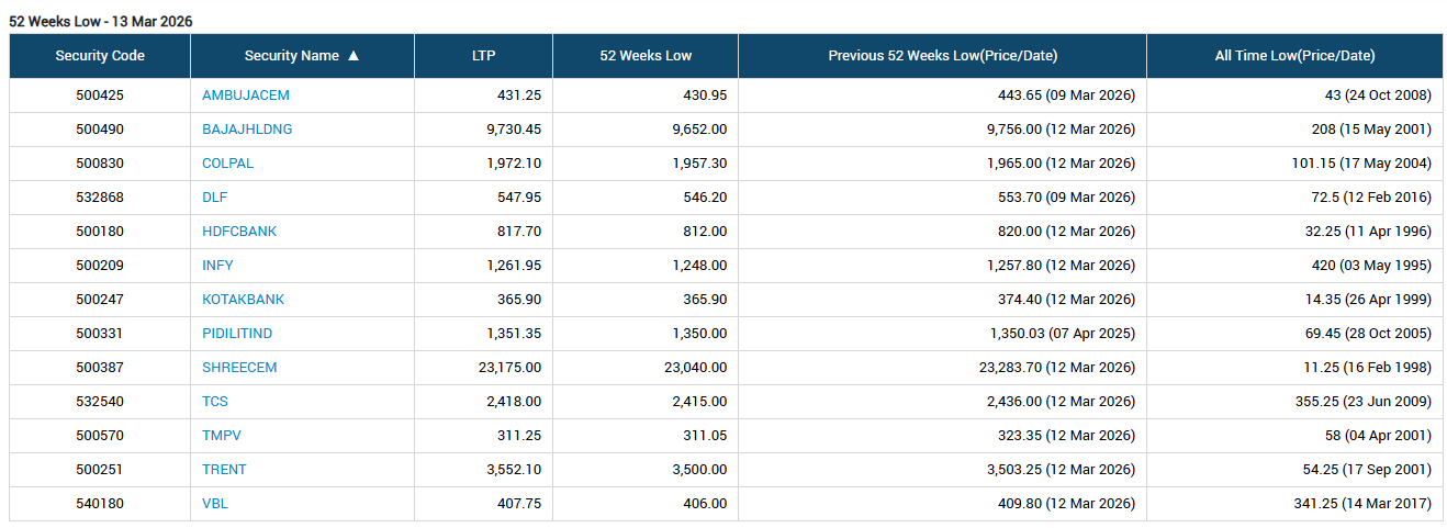 The broader market sell-off dragged several blue-chip names in the BSE 100 index down to their 52-week lows. Notable names included HDFC Bank Ltd at Rs 812, alongside IT giants Tata Consultancy Services Ltd (TCS) and Infosys Ltd, which tumbled to Rs 2,415 and Rs 1,248, respectively.