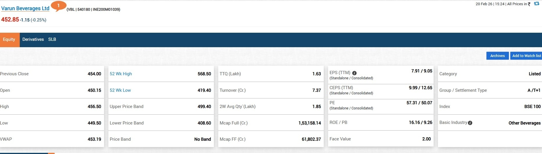 In the current session, Varun Beverages stock was trading 0.33% higher at Rs 456.50 against the previous close of Rs 454. A total of 1.27 lakh shares of the firm changed hands, amounting to a turnover of Rs 5.74 crore. Market cap of the firm stood at Rs 1.54 lakh crore.