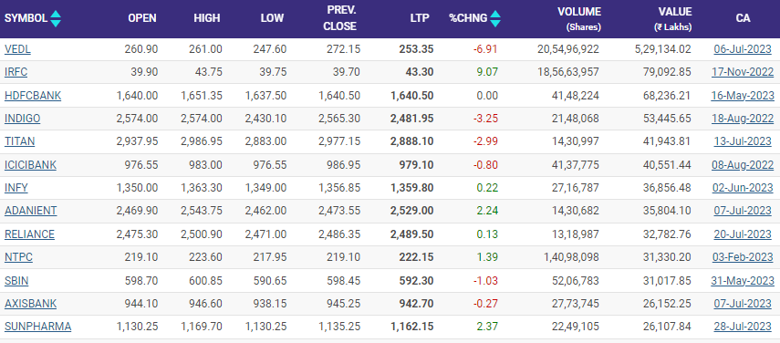 Titan Company, ICICI Bank, Infosys, Reliance Industries and NTPC were among other stocks seeing high turnover in Thursday's trade.Vedanta topped the volume chart on NSE. The stock was down 7.40 per cent at Rs 252, as 20,34,13,450 shares worth Rs 5,238.71 crore changed hands on the counter by 10.35 am. There were media reports that suggested a promoter group entity Twin Star Holdings was looking to offload 4.3 per cent stake in the mining company for Rs 4,136 crore. This the report suggested was a part of Vedanta's plan to reduce debts.