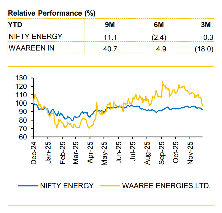 Over the 9-month period, Waaree Energies (up 40.7 per cent) has significantly outperformed Nifty Energy Index (up 11.1 per cent), indicating strong earlier momentum, possibly driven by stock-specific triggers or sector tailwinds. Similarly, Waaree's (up 4.9 per cent) has shown significant resilience against the Nifty Energy index (down 2.4 per cent).