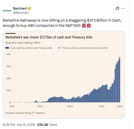 Arora was replaying to a post that suggested Berkshire Hathaway was now sitting on a staggering $373 billion in Cash, enough to buy 480 companies in the S&P500 index.