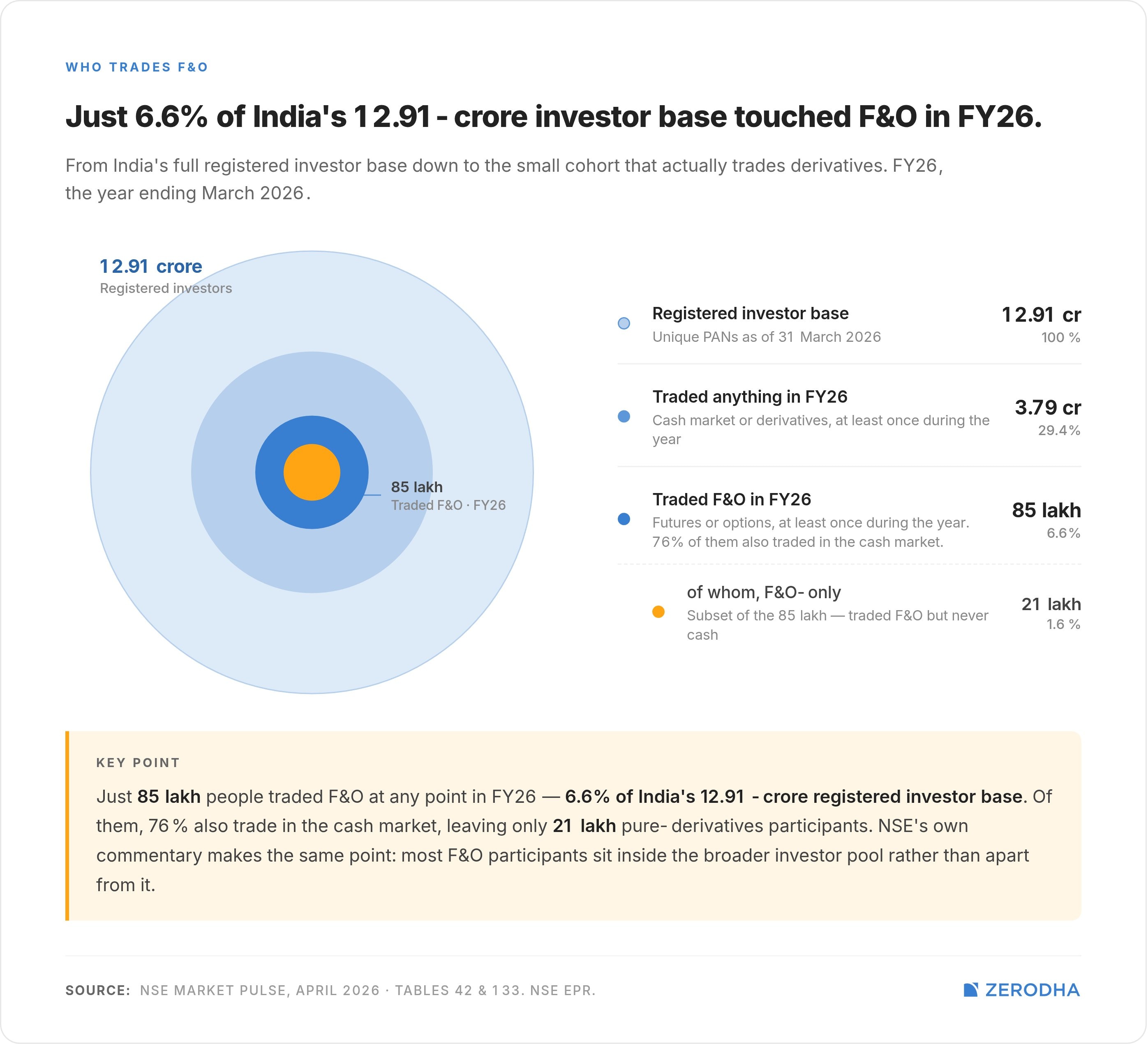 Of the 85 lakh F&O participants, 21 lakh traded solely in F&O without investing in the cash market, accounting for just 1.6 per cent of the total investor base.