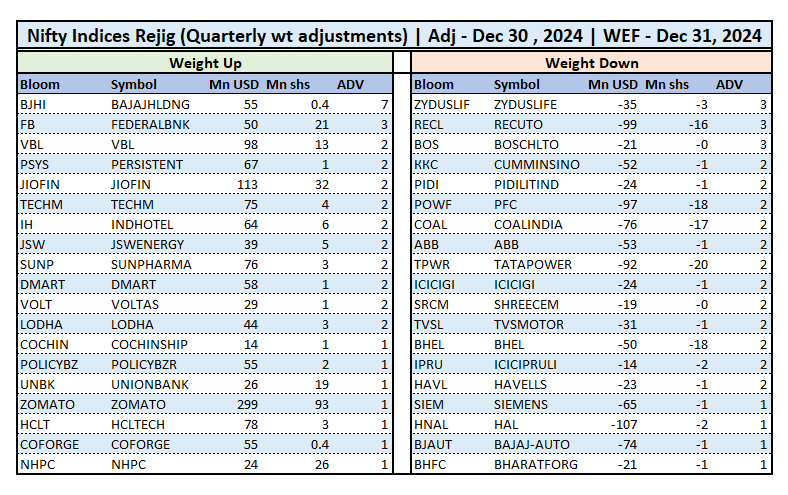 The Nifty indices quarterly adjustments is scheduled today and since it primarily involves float-led weight adjustments, the impact is expected to be relatively muted. Zomato Ltd may attract the highest inflows due to passive buying. It is expected to see buying to the tune of 9.3 crore shares worth $299 million.