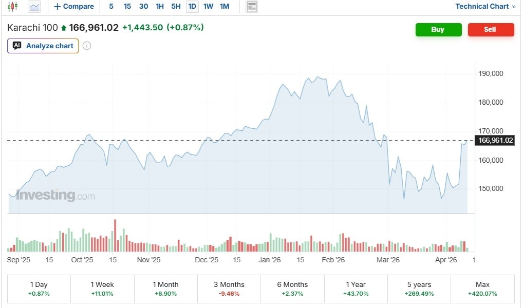 On April 8, Pakistan’s benchmark KSE-100 index recorded a historic intraday surge, jumping over 12,000 points after reports of a US-Iran ceasefire lifted investor sentiment. According to Dawn, the index climbed 12,362.38 points, or 8.15%, to touch 164,035.83 in early trade. The sharp spike triggered a temporary trading halt, in line with exchange rules aimed at managing extreme volatility. This marked the largest single-day gain in absolute terms for the index.