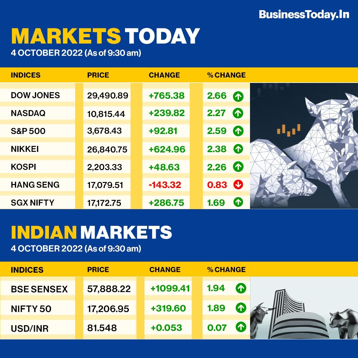 Share Market News Today Updates, 4 October 2022: Sensex and Nifty rebounded more than 2 per cent, respectively, today.Indian equity benchmarks on Tuesday rebounded sharply as bulls appeared to be back in charge, tracking positive global markets. IndusInd Bank, Adani Ports, Bajaj Finance, Coal India and TCS were among the top gainers on the NSE platform today with their shares up as much as 5.25 per cent. PowerGrid and Dr Reddy's were among the top losers.