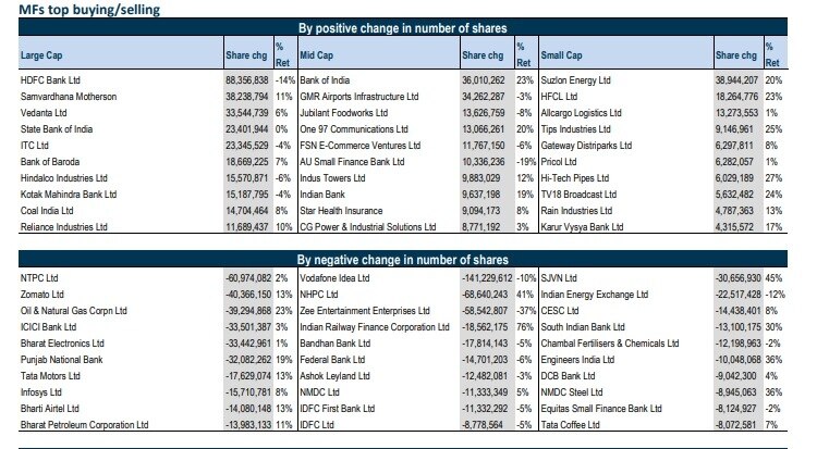 In the largecap space, MFs were seen buying shares of HDFC Bank Ltd, Samvardhana Motherson, Vedanta Ltd, State Bank of India, ITC Ltd and Bank of Baroda, among others.