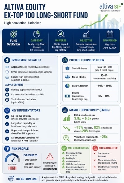 The fund is best suited for experienced investors with a high risk appetite who are comfortable with market volatility and complex strategies like long-short investing.As volatility returns to mid- and small-cap (SMID) stocks after a sharp rally in recent years, new investment strategies are emerging to capture opportunities while managing risk. One such offering is the Altiva Equity Ex-Top 100 Long-Short Fund, positioned as a differentiated play on India’s SMID universe.
