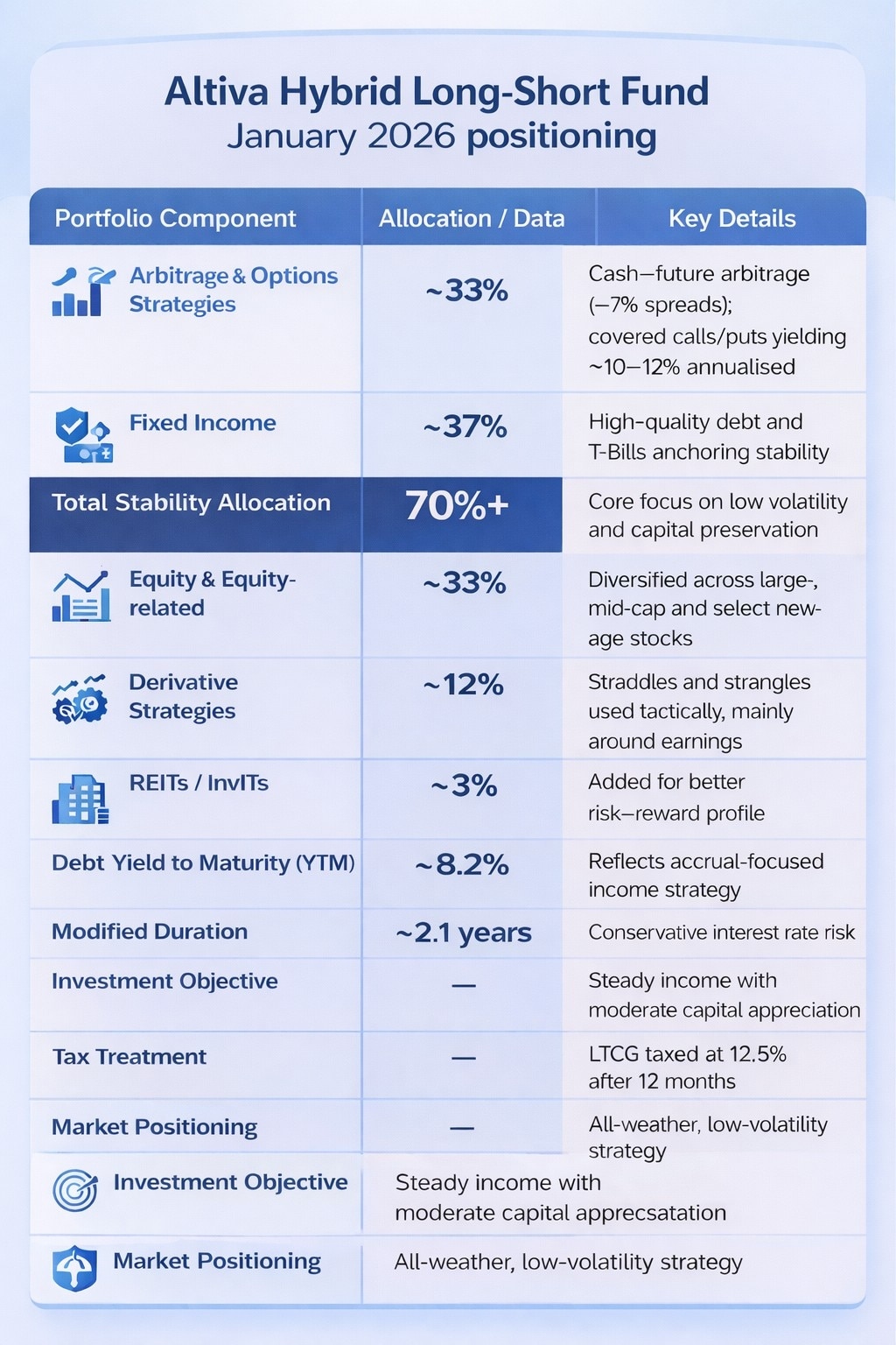 A key differentiator for the Altiva Hybrid Long-Short Fund is tax efficiency. Gains held for over 12 months are taxed as long-term capital gains at 12.5%, making the structure more tax-efficient than many Category III alternative investment funds or note-style products that pursue similar strategies.