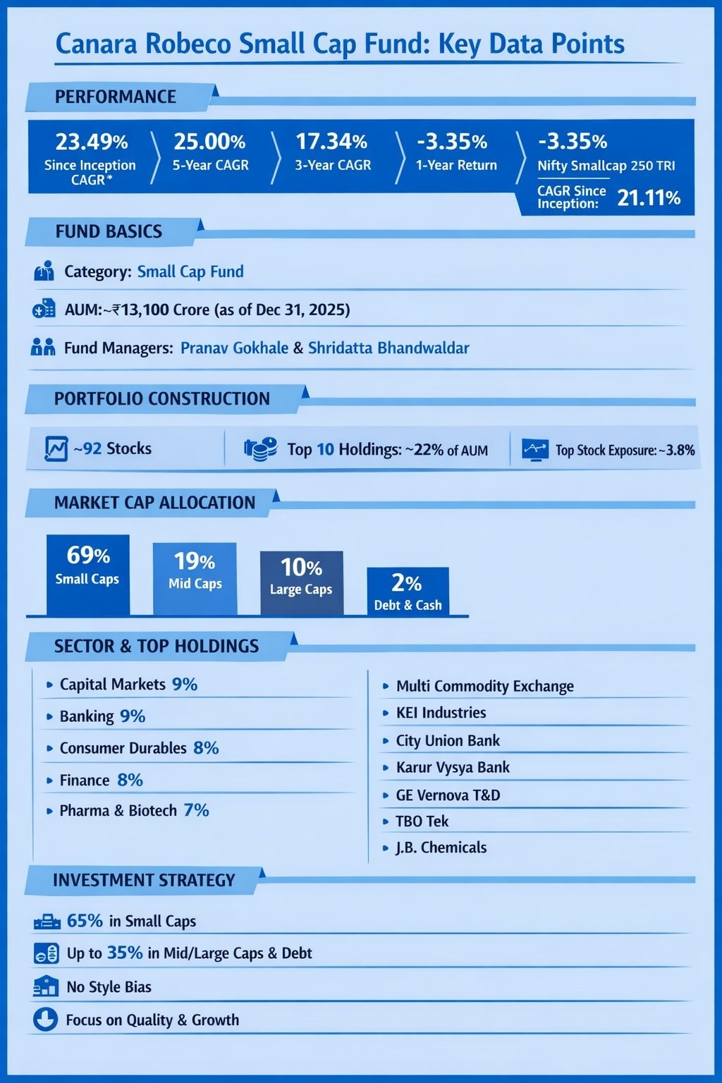 From a strategy standpoint, the Canara Robeco Small Cap Fund follows a quality-first approach, focusing on companies with strong business models, competent management, good governance standards, and reasonable valuations. According to the fund house, stock selection is driven by in-house fundamental research rather than short-term market momentum, with an emphasis on earnings visibility and balance-sheet strength.