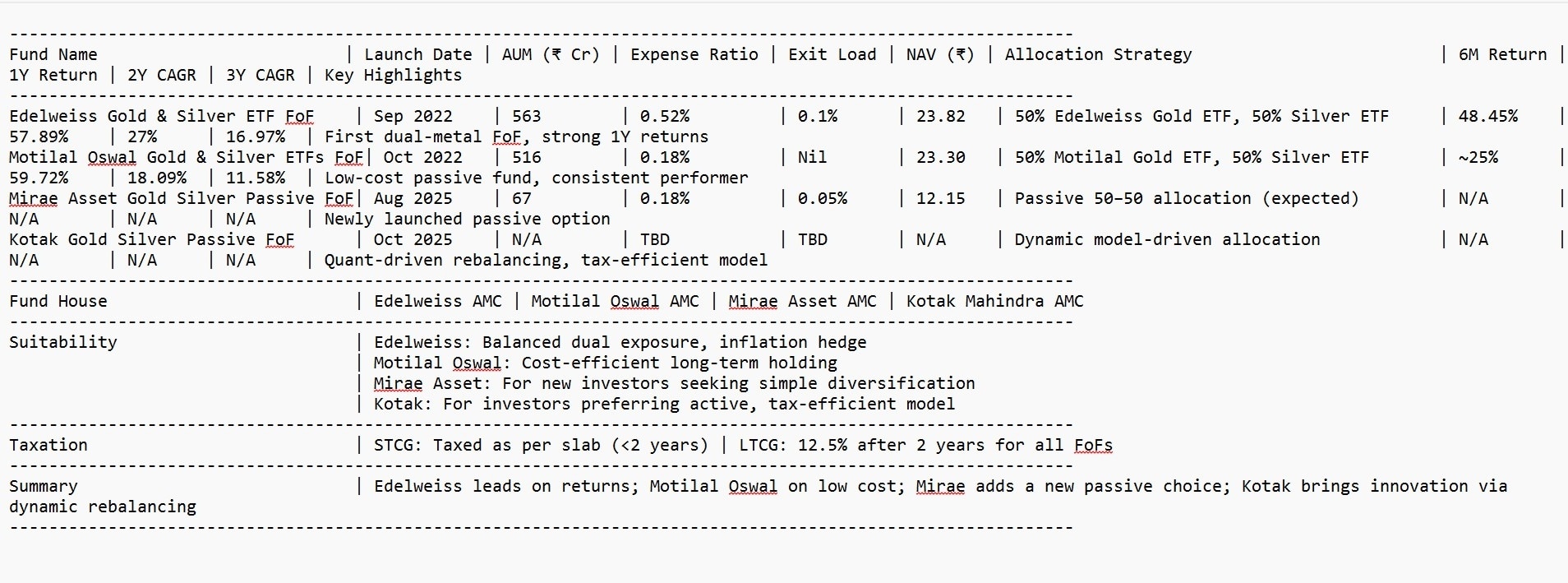 Gold ETFs have long dominated the commodities space, but silver ETFs are relatively recent entrants, having arrived in India in 2022. Combining both in a single fund allows investors to participate in the performance of both metals without directly handling physical assets or multiple ETFs. Four major funds — Kotak Gold Silver Passive FoF, Mirae Asset Gold Silver Passive FoF, Edelweiss Gold and Silver ETF FoF, and Motilal Oswal Gold and Silver ETFs FoF — now lead this emerging category.