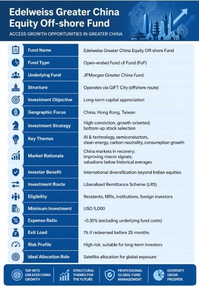 Overall, the Edelweiss Greater China Equity Fund stands out as a strategic international diversification vehicle. By combining exposure to structural growth themes, attractive valuations, and global fund management expertise, it provides Indian investors with a compelling avenue to complement domestic equity portfolios and participate in the next phase of growth in the Greater China region.
