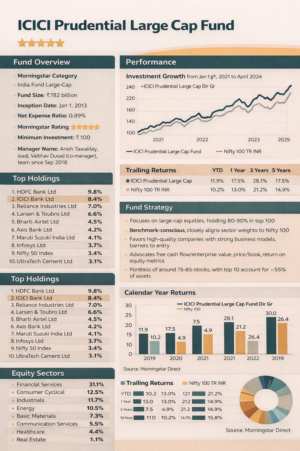 Launched in January 2013, the fund operates within the India Large-Cap category and has earned a five-star Morningstar rating along with a Gold Analyst Rating, reflecting strong analyst conviction in its investment process, people and long-term return potential. The fund carries a net expense ratio of 0.89% and a low minimum investment requirement of Rs 100, keeping it accessible for retail investors.