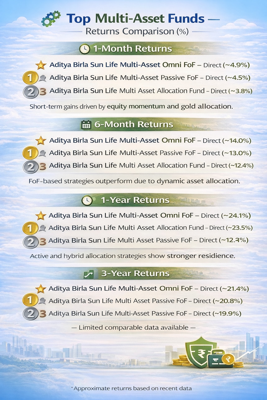 Performance data for multi-asset funds shows differentiated outcomes across time horizons. In the short term, one-month returns have been driven by equity momentum and gold strength, with funds such as Aditya Birla Sun Life Multi-Asset Omni FoF and its passive counterpart posting gains of around 4.5–5%. Over six months, actively managed and fund-of-funds strategies have outperformed, while more conservative multi-asset schemes have lagged.
