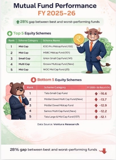 Mid-cap schemes accounted for three of the top five performers, led by the ICICI Prudential Midcap Fund, which returned 11.1%.Mutual fund performance in FY 2025–26 has revealed a sharp divergence between top and bottom performers, underscoring the growing importance of fund selection in a volatile equity market. Data shared by research analyst Mitesh Pate highlights a significant 28 percentage point gap between the best and worst-performing schemes, reinforcing that where you invest can materially impact returns.