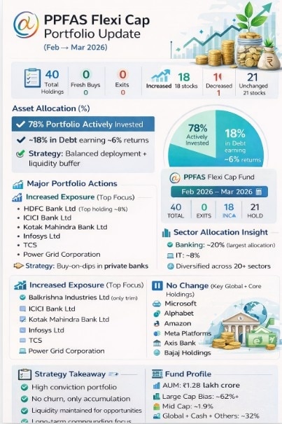 PPFAS Flexi Cap manages assets worth around ₹1.28 lakh crore and maintains a strong large-cap bias of over 62%.The Parag Parikh Flexi Cap Fund (PPFAS Flexi Cap) has maintained a measured yet active investment stance in March 2026, holding close to 18% of its portfolio in cash and equivalents while continuing to deploy capital across key opportunities. The allocation highlights a dual strategy—keeping liquidity intact while ensuring that a significant portion of the portfolio remains actively invested.