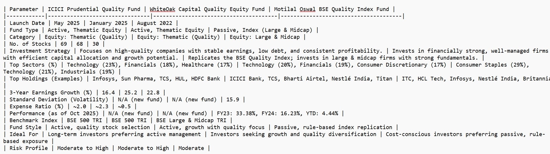 In comparison, both the ICICI Prudential Quality Fund and the WhiteOak Capital Quality Equity Fund, which were launched in 2025, are relatively new entrants to the market and do not yet have published performance records.