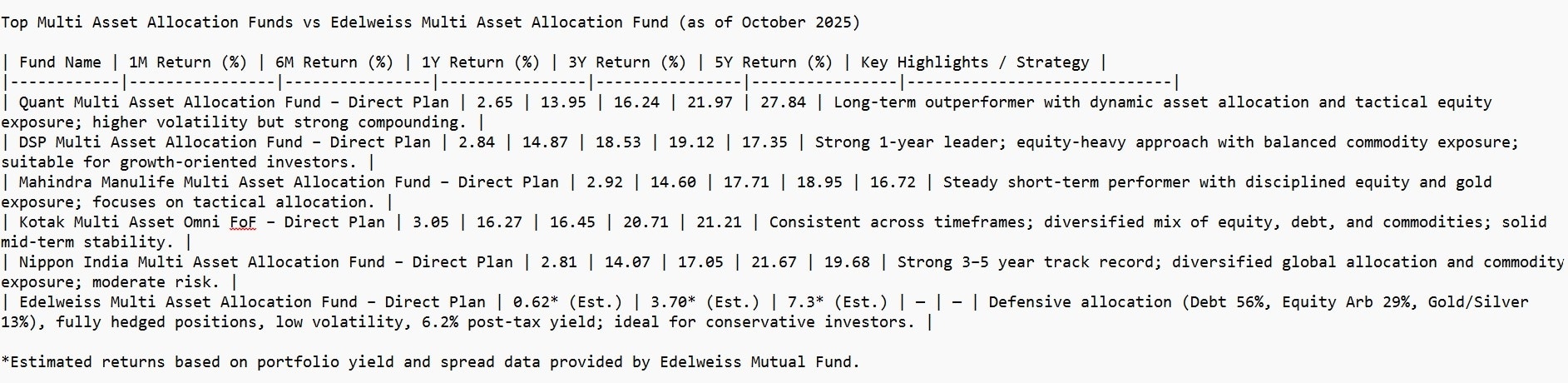 While Edelweiss focuses on consistency, other multi-asset funds have taken more aggressive calls. According to data as of October 2025, the Quant Multi Asset Allocation Fund – Direct Plan dominates long-term performance, returning 21.97% (3 years) and 27.84% (5 years). Its tactical equity exposure and dynamic rebalancing strategy have helped it outperform peers in bullish phases.