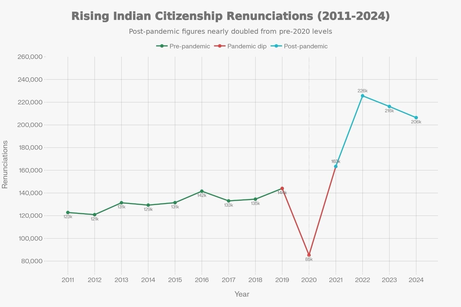 Annual numbers climbed steadily from ~1.2-1.4 lakh in the early 2010s to peaks above 2 lakh post-2021. The COVID dip in 2020 (85,256) proved temporary, as renunciations rebounded sharply.