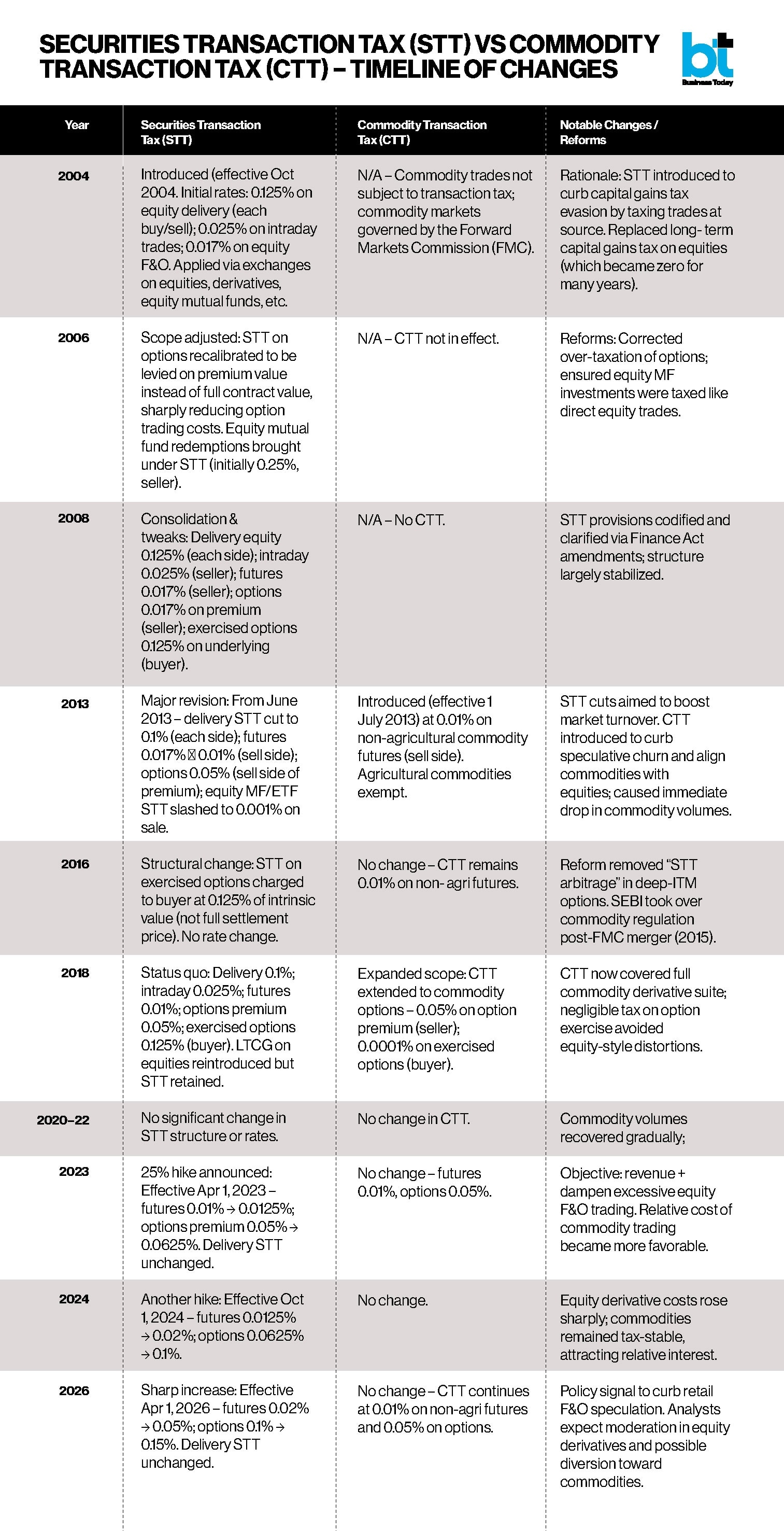 Futures traders, for instance, will now pay more than double the previous STT on each transaction, while options traders face a significant increase in levy on premiums and exercised contracts. Commodity markets, by contrast, continue to operate under the existing CTT regime with no changes. That tax symmetry, or lack of it, matters because both equity and commodity derivatives contribute to price discovery and risk transfer, and are increasingly used by institutional participants who straddle both arenas.