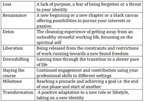 Whatever metaphor is used to describe the post-career status, as people grow into retirement, their perspective often evolves. Vough, D Bataille, Sergeant Mary lee in 2004 identified following ways executives described their post career feelings / plans: