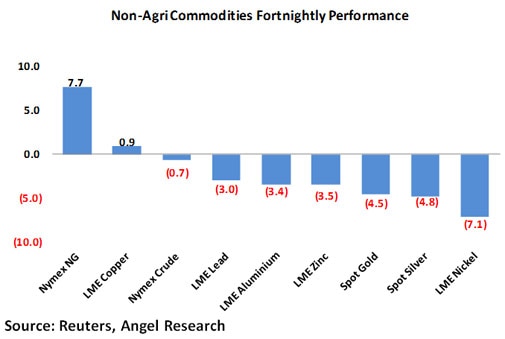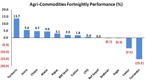 Among agri-commodities, Turmeric gained maximum during the fortnight on good export demand and news on crop damages in the south. In the last week, the turmeric prices witnessed sharp rise in prices from Rs 8,070 per quintals to Rs 9,196 levels. It has a gained 13.7 per cent after making a low of Rs 7,942 during the fortnight.