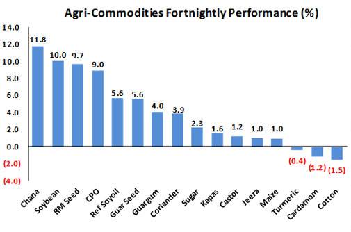 Last fortnight, chana prices surged more than any other agri-commodity in NCDEX. The most active chana Oct NCDEX contract closed higher by about 9.8 cent to close at Rs 4,560 per quintal on increasing demand from the stockists and pick up in festival demand from the mills and retail market. Further, government has extended the duty free import of chickpea, or chana, until this December to ensure remunerative prices to farmers and encourage them to plant the crop.