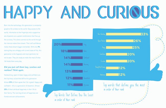 A. There was a perception many years ago that youth are lazy, but today's youth across the globe like to call themselves hard-working, open-minded, happy, confident, creative and loving. The level of optimism in today's youth is at an all -time high. Young people are confident that everything will get better. They also believe that they have the potential to change the world.