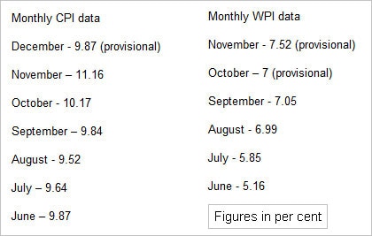 overall inflation . Figures released by the government on Monday (January 13) showed the consumer price index (CPI) having risen by 9.87 per cent in December 2013 as compared to the corresponding month the previous year. This is lower than the November CPI rise, which was 11.16 per cent.
