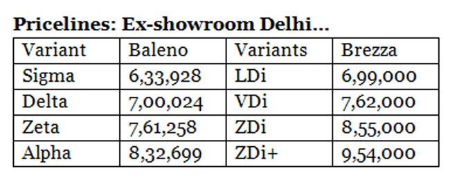 Baleno is a super hatchback for the buck with the starting priced at Rs 6.33 lakh for the base diesel variant, and offers expensive gizmos like ABS and Airbags as standard even on the base model, which is not the same in Brezza.