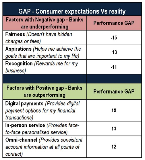According to the survey, banking consumers in India feel the banks' performances fare below expectations on several parameters The survey found banks underperforming on parameters such as fairness (no hidden charges), not helping in achieving consumer's financial goals, lack of consumer recognition etc. On the other hand, Indian banks exceeded consumer expectations in providing digital and personalised services etc.