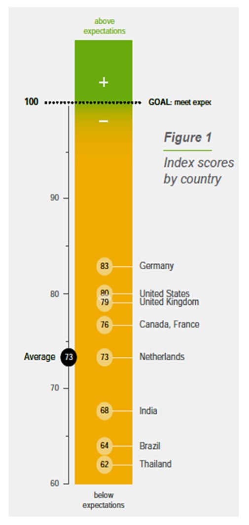 India scored 68 in the Index. The survey shows that while India's performance is below the average of 73, it performed better than Brazil and Thailand, the other two developing countries that participated in the survey.