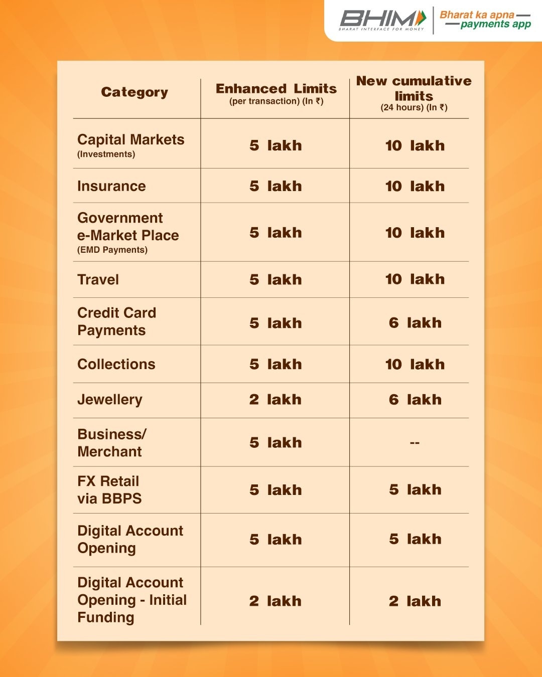 Collections & Business/Merchant Payments: Rs 5 lakh per transaction, with no daily cap for business payments