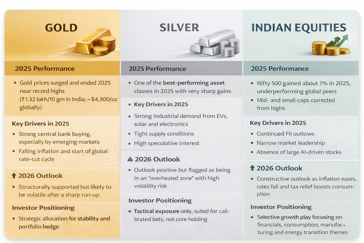 Together, the report paints a clear message for 2026: gold offers stability, silver offers opportunity with risk, and equities offer growth — but only for investors willing to be selective in a changing market landscape.