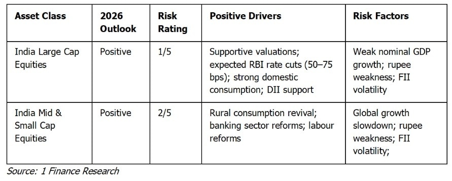 Indian equities underperformed most global peers in 2025, weighed down by FPI outflows, a 6% rupee depreciation against the dollar and weak urban consumption. For 2026, large caps are viewed more favourably than mid and small caps, given stronger earnings visibility and potential FII re-entry.