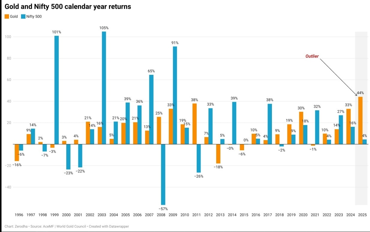 Nithin Kamath's comment has renewed the attention on how the yellow metal performed compared to equities in recent years.