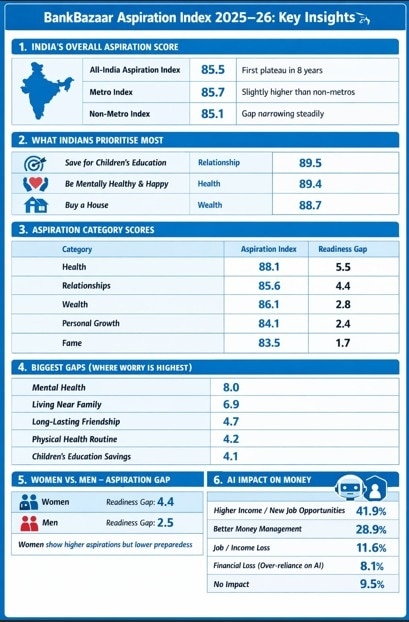 Health continues to rank as the top priority for Indians, ahead of wealth, relationships, personal growth, and fame. Within this category, mental health stands out as the most important goal.India’s financial priorities are not rising sharply this year — but they are not falling either. The BankBazaar Aspiration Index 2025–26 shows the All-India Aspiration Index at 85.5, unchanged from last year. It is the first time in eight years that the score has not increased.