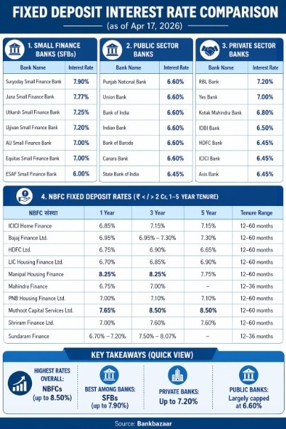 Among all banking categories, Small Finance Banks are currently leading the interest rate spectrum.Fixed deposit (FD) rates across India are witnessing a clear divergence, with Small Finance Banks (SFBs) offering the most attractive returns, followed by select private banks and NBFCs. Recent data as of April 17, 2026, indicates that SFBs have emerged as the top yield providers, while public sector banks continue to offer relatively lower but stable rates.