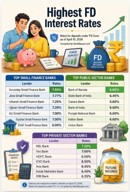 According to data compiled by BankBazaar from respective banks’ websites (as of April 10, 2026), FD rates continue to remain attractive across tenures, with small finance banks leading the pack.