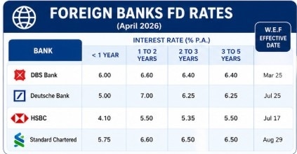 Foreign banks such as HSBC and DBS Bank are offering relatively lower FD rates, typically ranging between 4.1% and 6.6% depending on tenure. Deutsche Bank offers up to 7% for 1–2 year deposits, making it an exception within this category.