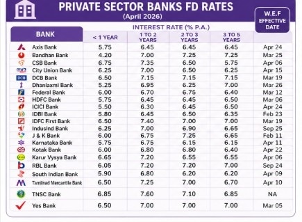 Among private sector lenders, IDFC First Bank is offering one of the highest rates at 7.4% for 1–2 year deposits and up to 7% for longer tenures. DCB Bank and RBL Bank also offer rates in the range of 7.15%–7.2% across key tenures, while Bandhan Bank provides up to 7.25% for 2–5 year deposits.