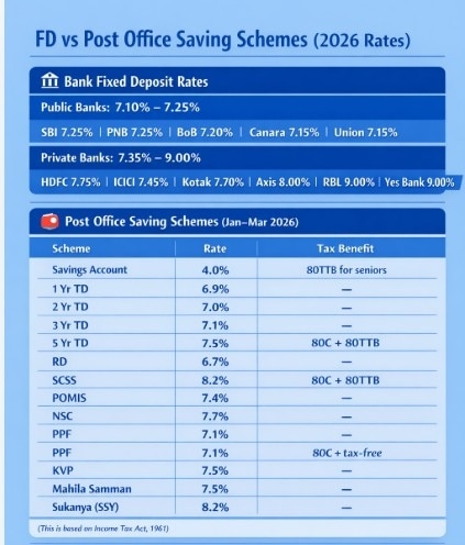 Recent FD rate data shows most public sector banks offering around 7.10%–7.25%, while private banks may offer slightly higher rates to attract deposits. But higher rates do not always mean better value, especially if the returns are fully taxable or if the bank is not considered as safe as a sovereign-backed scheme.