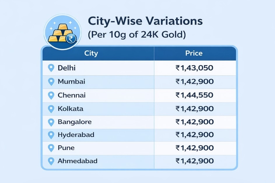 The price of 24K gold stood at ₹1,42,900 per 10 grams in Mumbai, Kolkata, Bengaluru, and Hyderabad, while Chennai recorded a higher rate of ₹1,44,550 per 10 grams. In Delhi, 24-carat gold was priced at ₹1,43,050 per 10 grams.