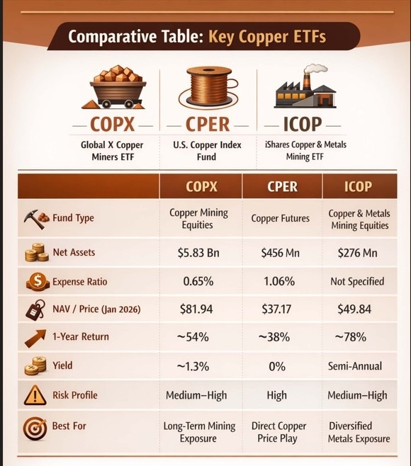 For those seeking more direct exposure to copper prices rather than mining stocks, CPER offers a different approach. The fund tracks copper futures and provides investors with a closer link to movements in the commodity itself. With net assets of about $456 million, CPER has posted a one-year return of nearly 38 per cent, driven by rising futures prices. However, its higher expense ratio of just over 1 per cent and the inherent volatility of futures-based products make it better suited to investors with a higher risk appetite.